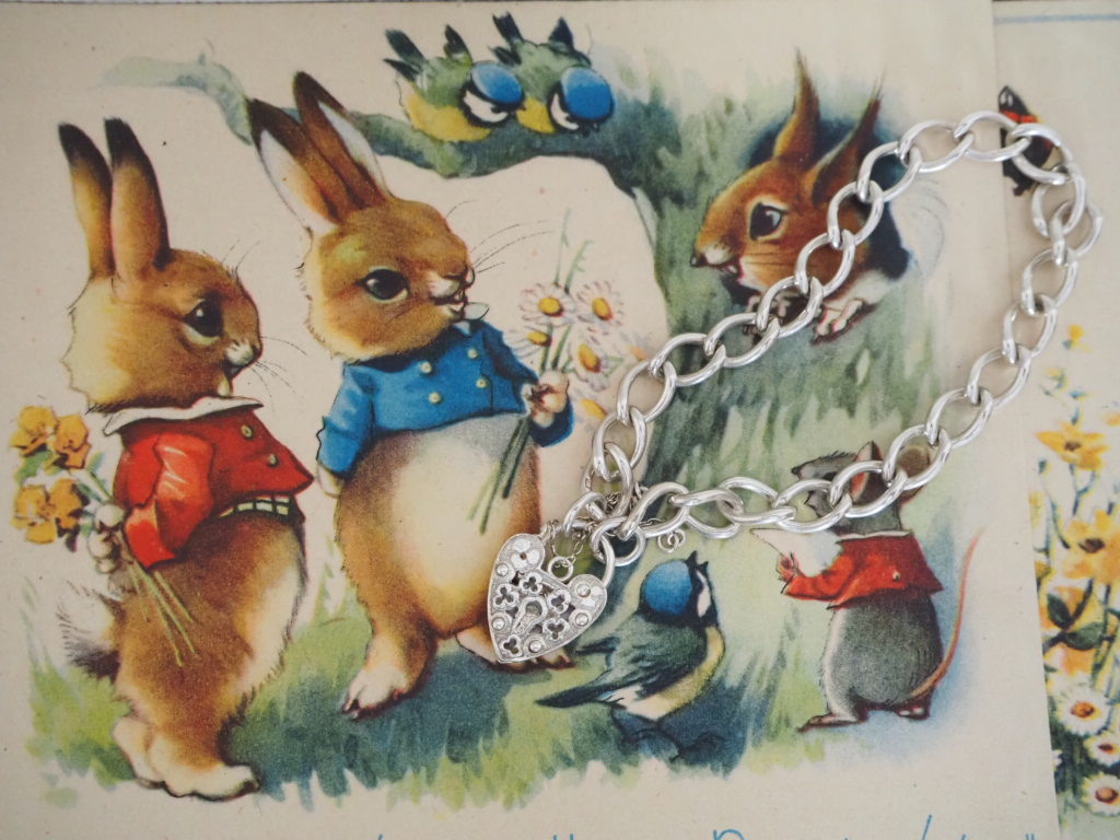 可愛いイラストのカードと、パドロック(南京錠)部分が透かし模様になっているシルバーブレスレット。