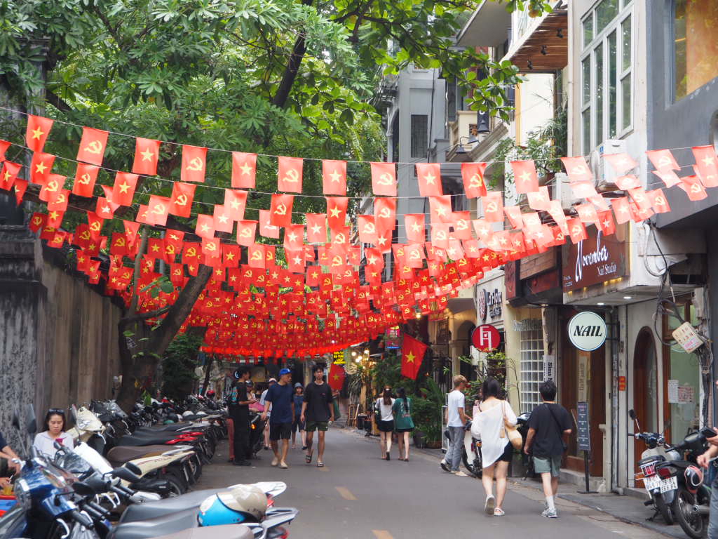 ベトナムの旗がはためく通り。