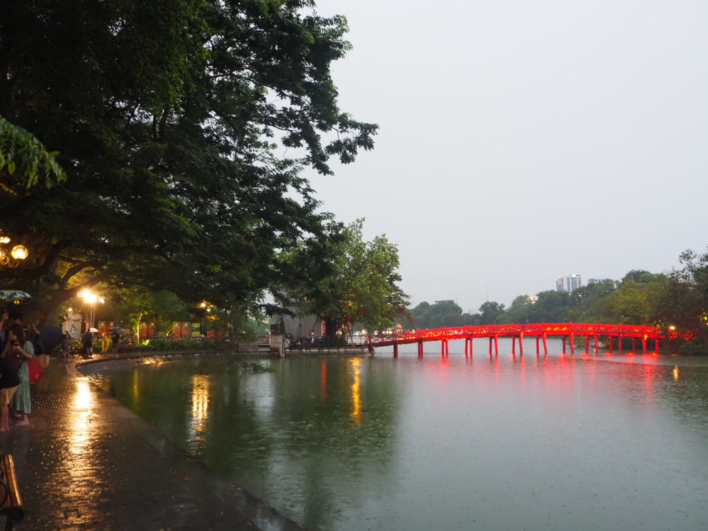 ホアン・キム湖の赤い橋もライトアップされています。