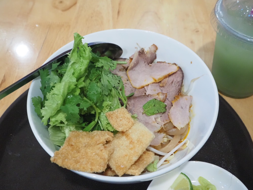 汁なしのフォーのようですが、パクチーなどのハーブの香りと青唐辛子の辛さもあって、とても美味しかったです。
